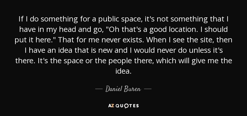 If I do something for a public space, it's not something that I have in my head and go, "Oh that's a good location. I should put it here." That for me never exists. When I see the site, then I have an idea that is new and I would never do unless it's there. It's the space or the people there, which will give me the idea.