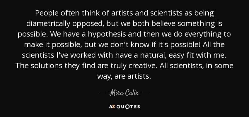 People often think of artists and scientists as being diametrically opposed, but we both believe something is possible. We have a hypothesis and then we do everything to make it possible, but we don't know if it's possible! All the scientists I've worked with have a natural, easy fit with me. The solutions they find are truly creative. All scientists, in some way, are artists.