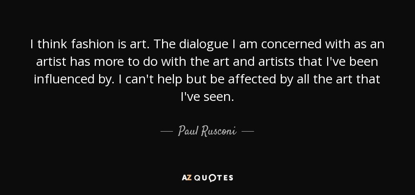I think fashion is art. The dialogue I am concerned with as an artist has more to do with the art and artists that I've been influenced by. I can't help but be affected by all the art that I've seen.