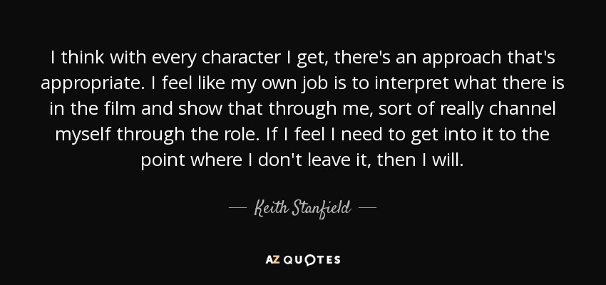 I think with every character I get, there's an approach that's appropriate. I feel like my own job is to interpret what there is in the film and show that through me, sort of really channel myself through the role. If I feel I need to get into it to the point where I don't leave it, then I will.