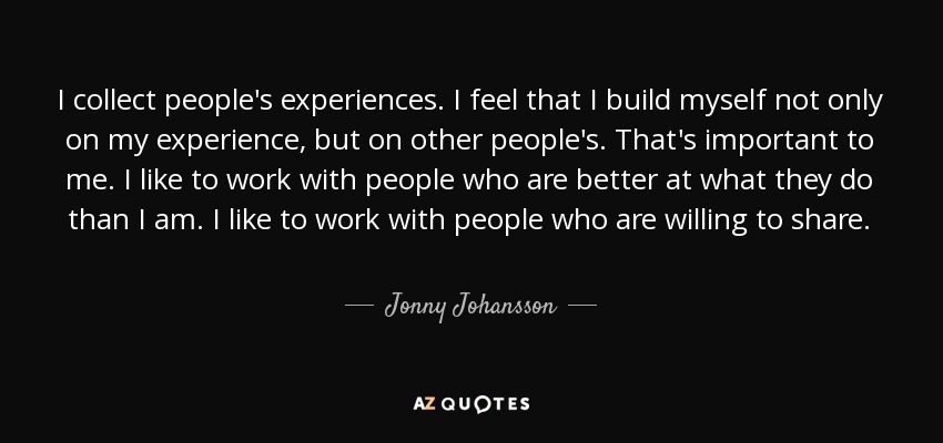 I collect people's experiences. I feel that I build myself not only on my experience, but on other people's. That's important to me. I like to work with people who are better at what they do than I am. I like to work with people who are willing to share.