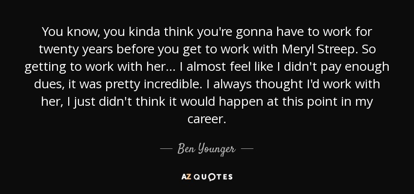 You know, you kinda think you're gonna have to work for twenty years before you get to work with Meryl Streep. So getting to work with her... I almost feel like I didn't pay enough dues, it was pretty incredible. I always thought I'd work with her, I just didn't think it would happen at this point in my career.