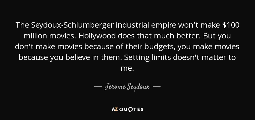 The Seydoux-Schlumberger industrial empire won't make $100 million movies. Hollywood does that much better. But you don't make movies because of their budgets, you make movies because you believe in them. Setting limits doesn't matter to me.
