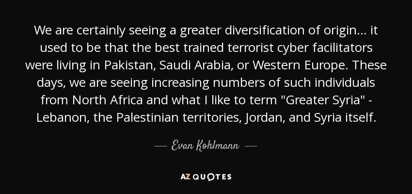 We are certainly seeing a greater diversification of origin... it used to be that the best trained terrorist cyber facilitators were living in Pakistan, Saudi Arabia, or Western Europe. These days, we are seeing increasing numbers of such individuals from North Africa and what I like to term "Greater Syria" - Lebanon, the Palestinian territories, Jordan, and Syria itself.