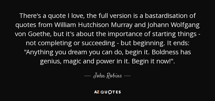 There's a quote I love, the full version is a bastardisation of quotes from William Hutchison Murray and Johann Wolfgang von Goethe, but it's about the importance of starting things - not completing or succeeding - but beginning. It ends: "Anything you dream you can do, begin it. Boldness has genius, magic and power in it. Begin it now!".