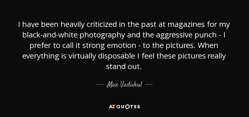 I have been heavily criticized in the past at magazines for my black-and-white photography and the aggressive punch - I prefer to call it strong emotion - to the pictures. When everything is virtually disposable I feel these pictures really stand out.