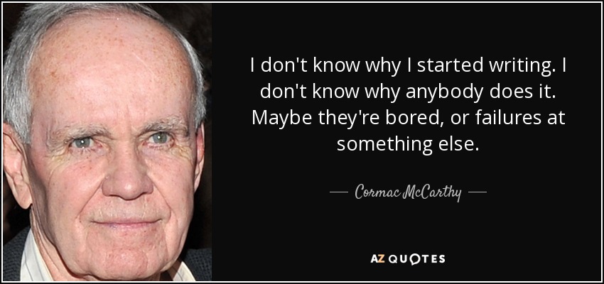 I don't know why I started writing. I don't know why anybody does it. Maybe they're bored, or failures at something else.