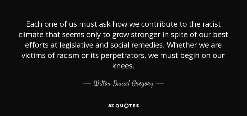 Each one of us must ask how we contribute to the racist climate that seems only to grow stronger in spite of our best efforts at legislative and social remedies. Whether we are victims of racism or its perpetrators, we must begin on our knees.