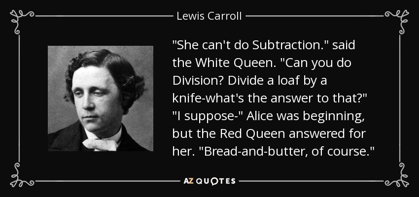 "She can't do Subtraction." said the White Queen. "Can you do Division? Divide a loaf by a knife-what's the answer to that?" "I suppose-" Alice was beginning, but the Red Queen answered for her. "Bread-and-butter, of course."