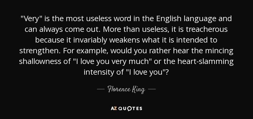 "Very" is the most useless word in the English language and can always come out. More than useless, it is treacherous because it invariably weakens what it is intended to strengthen. For example, would you rather hear the mincing shallowness of "I love you very much" or the heart-slamming intensity of "I love you"?