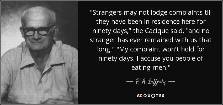 "Strangers may not lodge complaints till they have been in residence here for ninety days," the Cacique said, "and no stranger has ever remained with us that long." "My complaint won't hold for ninety days. I accuse you people of eating men."