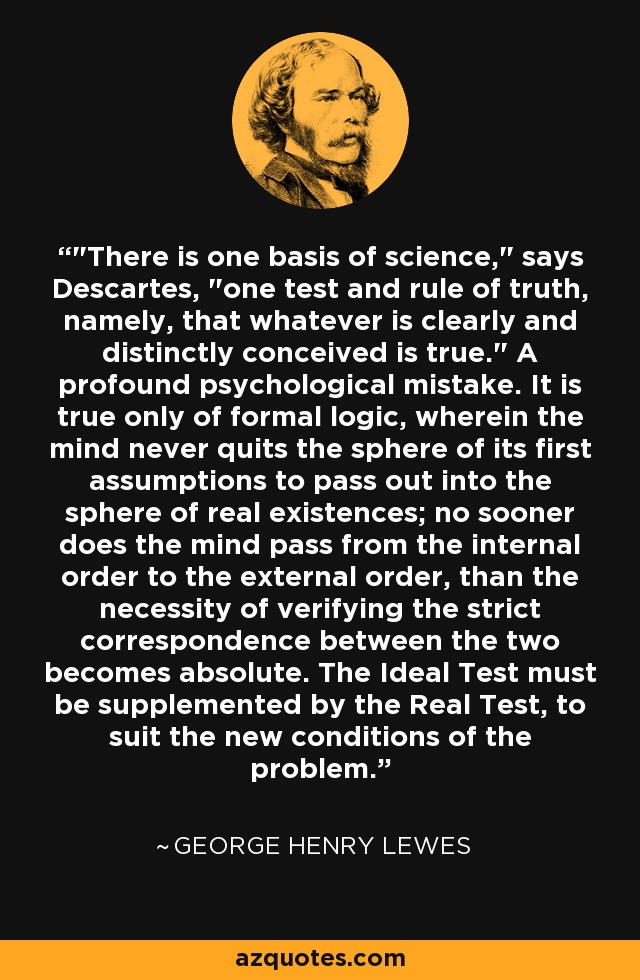 "There is one basis of science," says Descartes, "one test and rule of truth, namely, that whatever is clearly and distinctly conceived is true." A profound psychological mistake. It is true only of formal logic, wherein the mind never quits the sphere of its first assumptions to pass out into the sphere of real existences; no sooner does the mind pass from the internal order to the external order, than the necessity of verifying the strict correspondence between the two becomes absolute. The Ideal Test must be supplemented by the Real Test, to suit the new conditions of the problem.