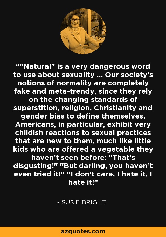 "Natural" is a very dangerous word to use about sexuality ... Our society's notions of normality are completely fake and meta-trendy, since they rely on the changing standards of superstition, religion, Christianity and gender bias to define themselves. Americans, in particular, exhibit very childish reactions to sexual practices that are new to them, much like little kids who are offered a vegetable they haven't seen before: "That's disgusting!" "But darling, you haven't even tried it!" "I don't care, I hate it, I hate it!