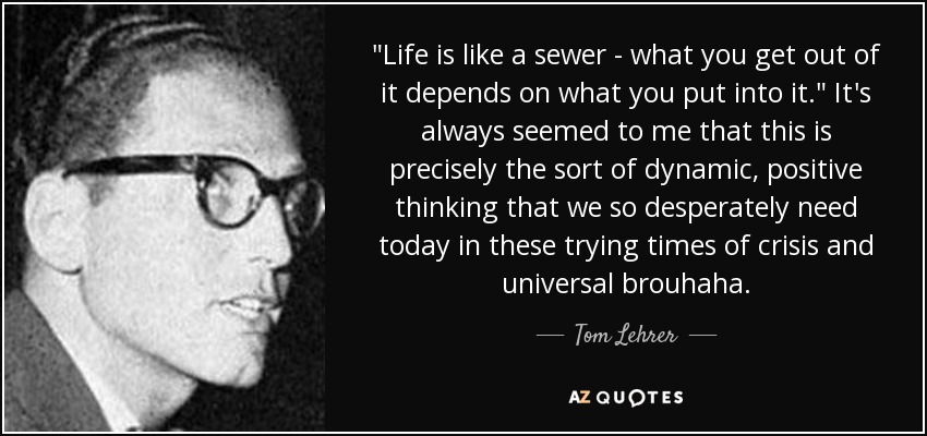 "Life is like a sewer - what you get out of it depends on what you put into it." It's always seemed to me that this is precisely the sort of dynamic, positive thinking that we so desperately need today in these trying times of crisis and universal brouhaha.