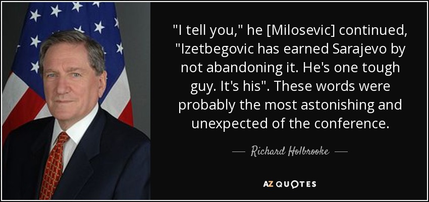 "I tell you," he [Milosevic] continued, "Izetbegovic has earned Sarajevo by not abandoning it. He's one tough guy. It's his". These words were probably the most astonishing and unexpected of the conference.