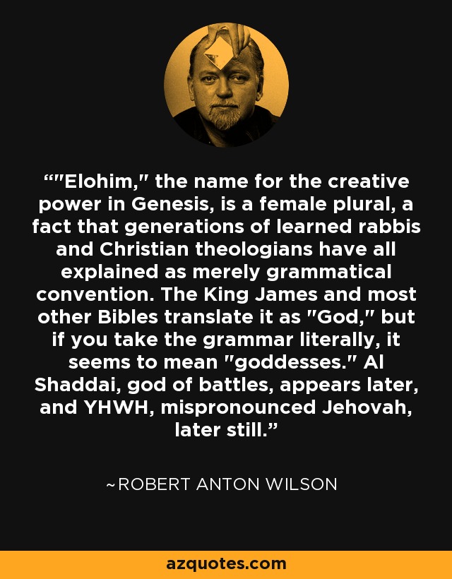 "Elohim," the name for the creative power in Genesis, is a female plural, a fact that generations of learned rabbis and Christian theologians have all explained as merely grammatical convention. The King James and most other Bibles translate it as "God," but if you take the grammar literally, it seems to mean "goddesses." Al Shaddai, god of battles, appears later, and YHWH, mispronounced Jehovah, later still.