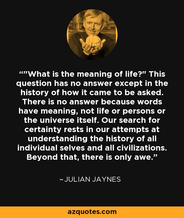 "What is the meaning of life?" This question has no answer except in the history of how it came to be asked. There is no answer because words have meaning, not life or persons or the universe itself. Our search for certainty rests in our attempts at understanding the history of all individual selves and all civilizations. Beyond that, there is only awe.