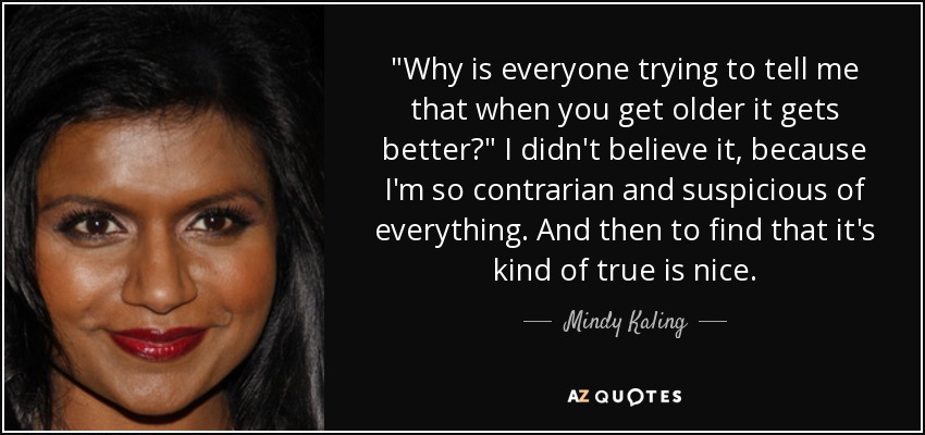 "Why is everyone trying to tell me that when you get older it gets better?" I didn't believe it, because I'm so contrarian and suspicious of everything. And then to find that it's kind of true is nice.
