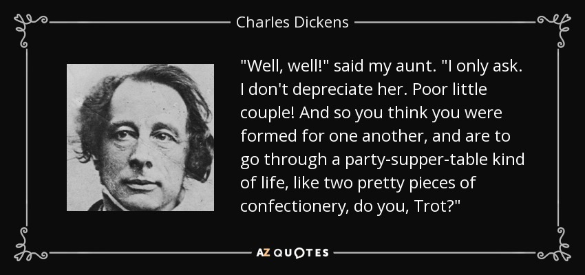 "Well, well!" said my aunt. "I only ask. I don't depreciate her. Poor little couple! And so you think you were formed for one another, and are to go through a party-supper-table kind of life, like two pretty pieces of confectionery, do you, Trot?"