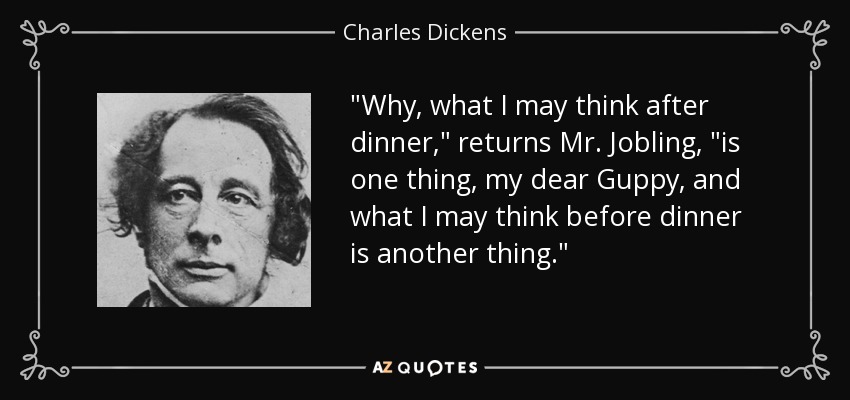 "Why, what I may think after dinner," returns Mr. Jobling, "is one thing, my dear Guppy, and what I may think before dinner is another thing."