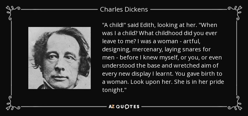 "A child!" said Edith, looking at her. "When was I a child? What childhood did you ever leave to me? I was a woman - artful, designing, mercenary, laying snares for men - before I knew myself, or you, or even understood the base and wretched aim of every new display I learnt. You gave birth to a woman. Look upon her. She is in her pride tonight."