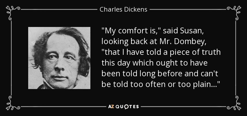 "My comfort is," said Susan, looking back at Mr. Dombey, "that I have told a piece of truth this day which ought to have been told long before and can't be told too often or too plain..."