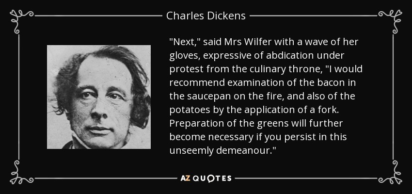 "Next," said Mrs Wilfer with a wave of her gloves, expressive of abdication under protest from the culinary throne, "I would recommend examination of the bacon in the saucepan on the fire, and also of the potatoes by the application of a fork. Preparation of the greens will further become necessary if you persist in this unseemly demeanour."