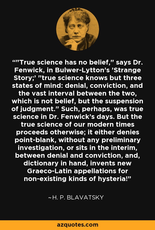 "True science has no belief," says Dr. Fenwick, in Bulwer-Lytton's 'Strange Story;' "true science knows but three states of mind: denial, conviction, and the vast interval between the two, which is not belief, but the suspension of judgment." Such, perhaps, was true science in Dr. Fenwick's days. But the true science of our modern times proceeds otherwise; it either denies point-blank, without any preliminary investigation, or sits in the interim, between denial and conviction, and, dictionary in hand, invents new Graeco-Latin appellations for non-existing kinds of hysteria!