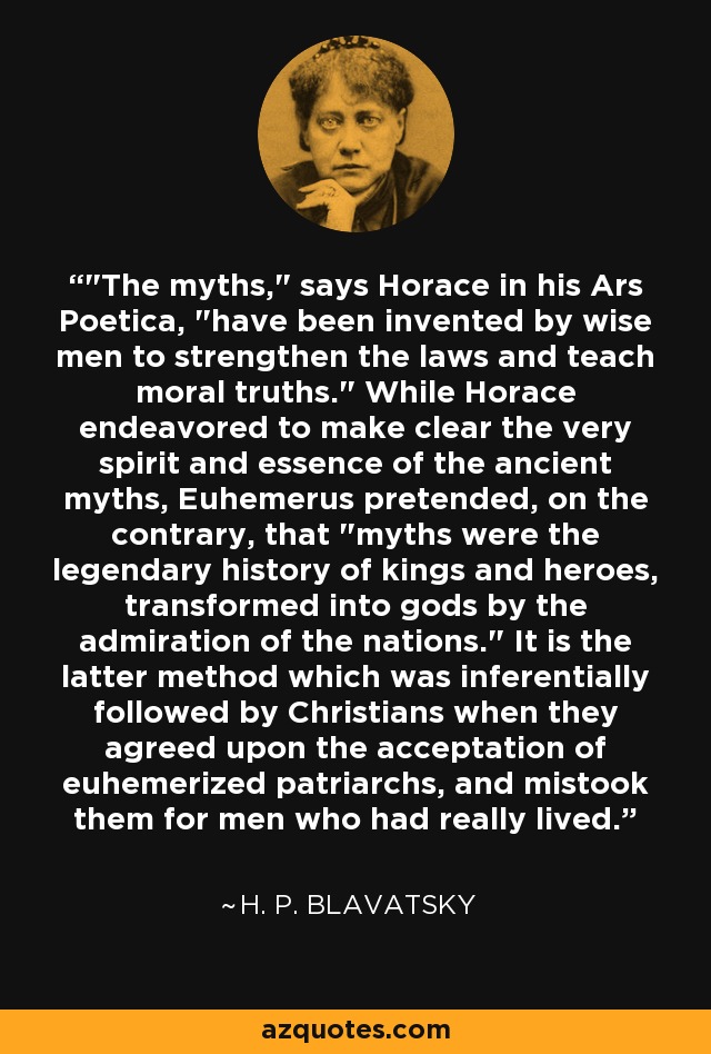 "The myths," says Horace in his Ars Poetica, "have been invented by wise men to strengthen the laws and teach moral truths." While Horace endeavored to make clear the very spirit and essence of the ancient myths, Euhemerus pretended, on the contrary, that "myths were the legendary history of kings and heroes, transformed into gods by the admiration of the nations." It is the latter method which was inferentially followed by Christians when they agreed upon the acceptation of euhemerized patriarchs, and mistook them for men who had really lived.