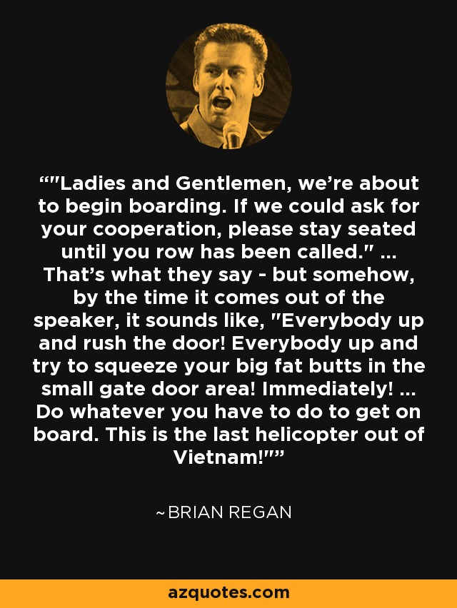 "Ladies and Gentlemen, we're about to begin boarding. If we could ask for your cooperation, please stay seated until you row has been called." ... That's what they say - but somehow, by the time it comes out of the speaker, it sounds like, "Everybody up and rush the door! Everybody up and try to squeeze your big fat butts in the small gate door area! Immediately! ... Do whatever you have to do to get on board. This is the last helicopter out of Vietnam!"