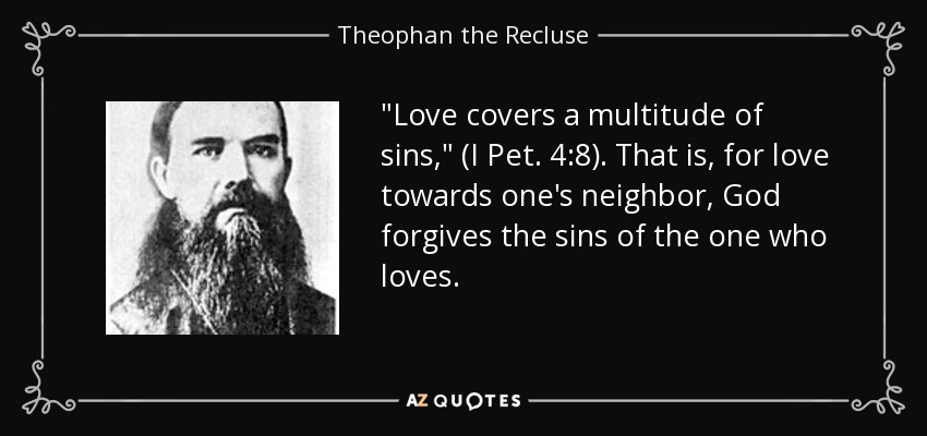 "Love covers a multitude of sins," (I Pet. 4:8). That is, for love towards one's neighbor, God forgives the sins of the one who loves.