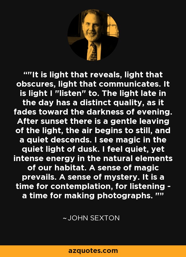 "It is light that reveals, light that obscures, light that communicates. It is light I "listen" to. The light late in the day has a distinct quality, as it fades toward the darkness of evening. After sunset there is a gentle leaving of the light, the air begins to still, and a quiet descends. I see magic in the quiet light of dusk. I feel quiet, yet intense energy in the natural elements of our habitat. A sense of magic prevails. A sense of mystery. It is a time for contemplation, for listening - a time for making photographs. "