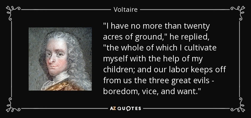"I have no more than twenty acres of ground," he replied, "the whole of which I cultivate myself with the help of my children; and our labor keeps off from us the three great evils - boredom, vice, and want."