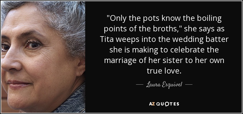 "Only the pots know the boiling points of the broths," she says as Tita weeps into the wedding batter she is making to celebrate the marriage of her sister to her own true love.