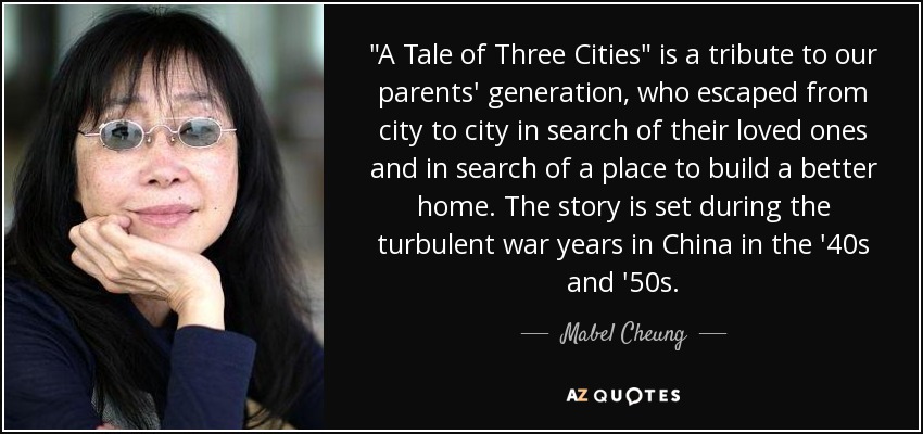 "A Tale of Three Cities" is a tribute to our parents' generation, who escaped from city to city in search of their loved ones and in search of a place to build a better home. The story is set during the turbulent war years in China in the '40s and '50s.