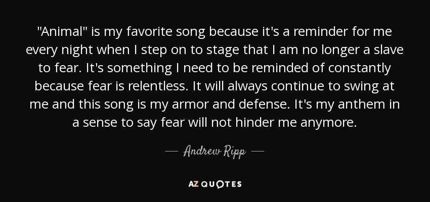 "Animal" is my favorite song because it's a reminder for me every night when I step on to stage that I am no longer a slave to fear. It's something I need to be reminded of constantly because fear is relentless. It will always continue to swing at me and this song is my armor and defense. It's my anthem in a sense to say fear will not hinder me anymore.