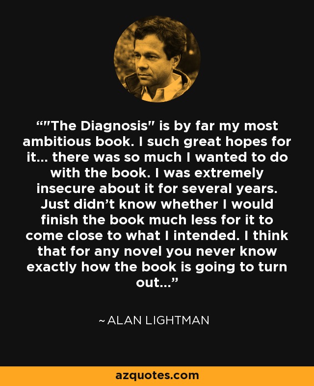 "The Diagnosis" is by far my most ambitious book. I such great hopes for it... there was so much I wanted to do with the book. I was extremely insecure about it for several years. Just didn't know whether I would finish the book much less for it to come close to what I intended. I think that for any novel you never know exactly how the book is going to turn out...