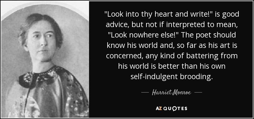 "Look into thy heart and write!" is good advice, but not if interpreted to mean, "Look nowhere else!" The poet should know his world and, so far as his art is concerned, any kind of battering from his world is better than his own self-indulgent brooding.
