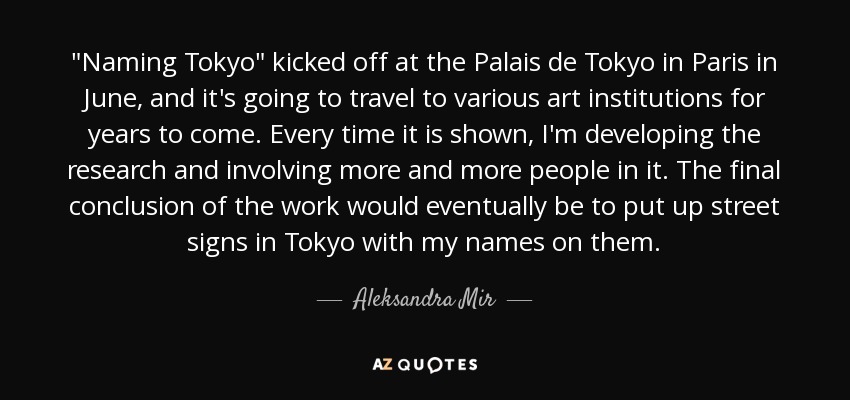 "Naming Tokyo" kicked off at the Palais de Tokyo in Paris in June, and it's going to travel to various art institutions for years to come. Every time it is shown, I'm developing the research and involving more and more people in it. The final conclusion of the work would eventually be to put up street signs in Tokyo with my names on them.