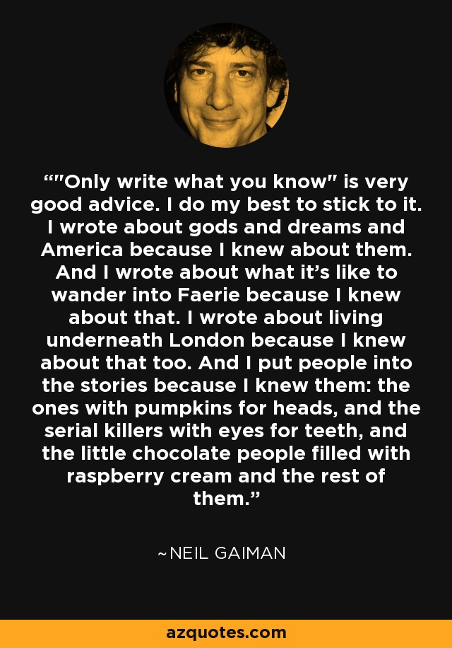 "Only write what you know" is very good advice. I do my best to stick to it. I wrote about gods and dreams and America because I knew about them. And I wrote about what it's like to wander into Faerie because I knew about that. I wrote about living underneath London because I knew about that too. And I put people into the stories because I knew them: the ones with pumpkins for heads, and the serial killers with eyes for teeth, and the little chocolate people filled with raspberry cream and the rest of them.
