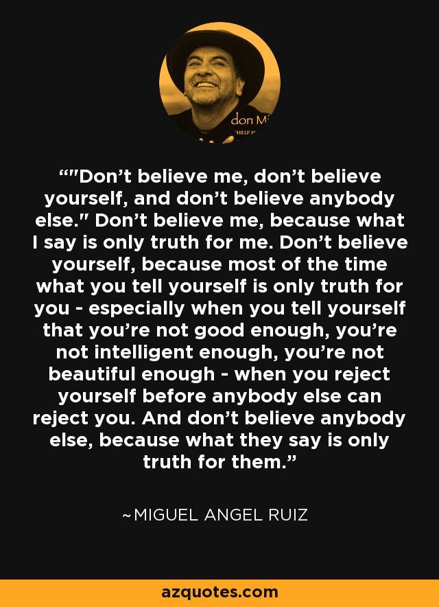 "Don't believe me, don't believe yourself, and don't believe anybody else." Don't believe me, because what I say is only truth for me. Don't believe yourself, because most of the time what you tell yourself is only truth for you - especially when you tell yourself that you're not good enough, you're not intelligent enough, you're not beautiful enough - when you reject yourself before anybody else can reject you. And don't believe anybody else, because what they say is only truth for them.