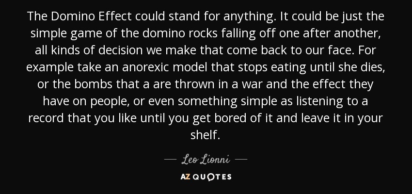 The Domino Effect could stand for anything. It could be just the simple game of the domino rocks falling off one after another, all kinds of decision we make that come back to our face. For example take an anorexic model that stops eating until she dies, or the bombs that a are thrown in a war and the effect they have on people, or even something simple as listening to a record that you like until you get bored of it and leave it in your shelf.