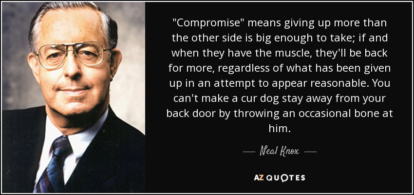 "Compromise" means giving up more than the other side is big enough to take; if and when they have the muscle, they'll be back for more, regardless of what has been given up in an attempt to appear reasonable. You can't make a cur dog stay away from your back door by throwing an occasional bone at him.