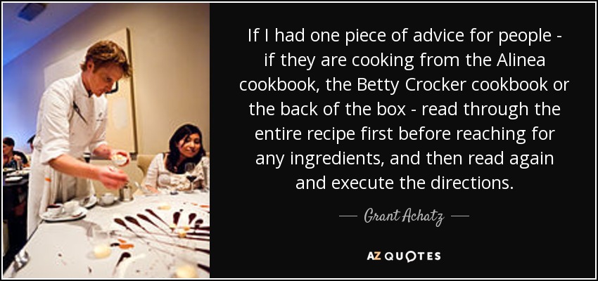 If I had one piece of advice for people - if they are cooking from the Alinea cookbook, the Betty Crocker cookbook or the back of the box - read through the entire recipe first before reaching for any ingredients, and then read again and execute the directions.