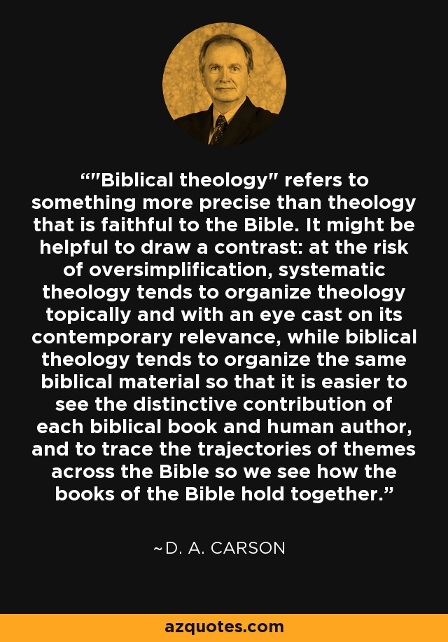"Biblical theology" refers to something more precise than theology that is faithful to the Bible. It might be helpful to draw a contrast: at the risk of oversimplification, systematic theology tends to organize theology topically and with an eye cast on its contemporary relevance, while biblical theology tends to organize the same biblical material so that it is easier to see the distinctive contribution of each biblical book and human author, and to trace the trajectories of themes across the Bible so we see how the books of the Bible hold together.