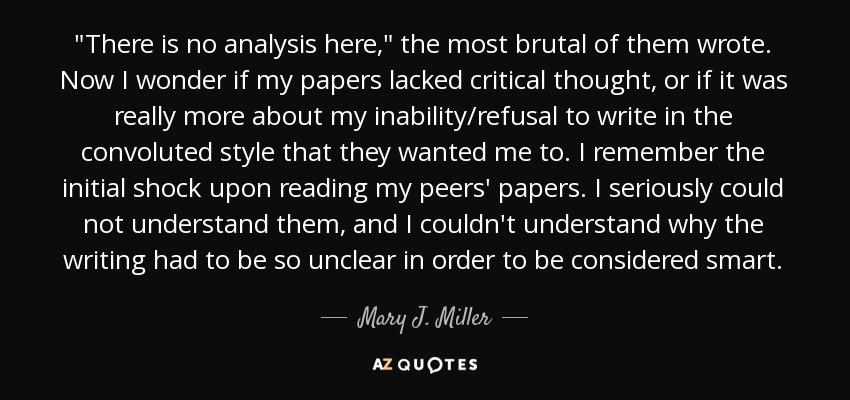 "There is no analysis here," the most brutal of them wrote. Now I wonder if my papers lacked critical thought, or if it was really more about my inability/refusal to write in the convoluted style that they wanted me to. I remember the initial shock upon reading my peers' papers. I seriously could not understand them, and I couldn't understand why the writing had to be so unclear in order to be considered smart.