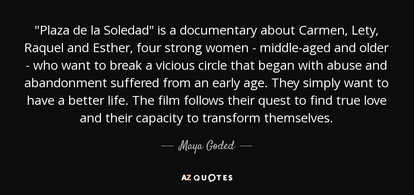 "Plaza de la Soledad" is a documentary about Carmen, Lety, Raquel and Esther, four strong women - middle-aged and older - who want to break a vicious circle that began with abuse and abandonment suffered from an early age. They simply want to have a better life. The film follows their quest to find true love and their capacity to transform themselves.