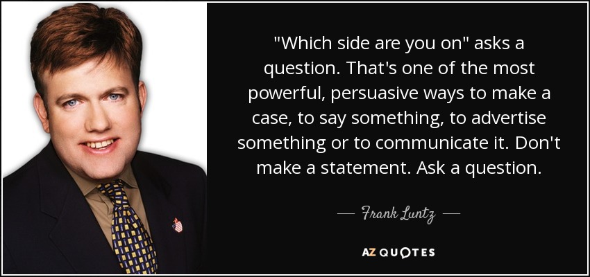 "Which side are you on" asks a question. That's one of the most powerful, persuasive ways to make a case, to say something, to advertise something or to communicate it. Don't make a statement. Ask a question.