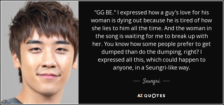 "GG BE." I expressed how a guy's love for his woman is dying out because he is tired of how she lies to him all the time. And the woman in the song is waiting for me to break up with her. You know how some people prefer to get dumped than do the dumping, right? I expressed all this, which could happen to anyone, in a Seungri-like way.
