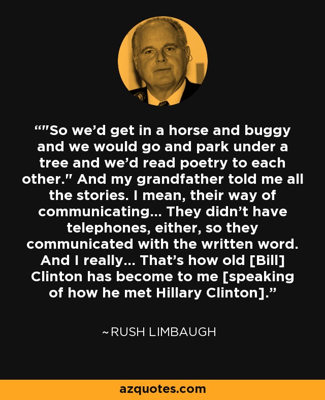 "So we'd get in a horse and buggy and we would go and park under a tree and we'd read poetry to each other." And my grandfather told me all the stories. I mean, their way of communicating... They didn't have telephones, either, so they communicated with the written word. And I really... That's how old [Bill] Clinton has become to me [speaking of how he met Hillary Clinton].